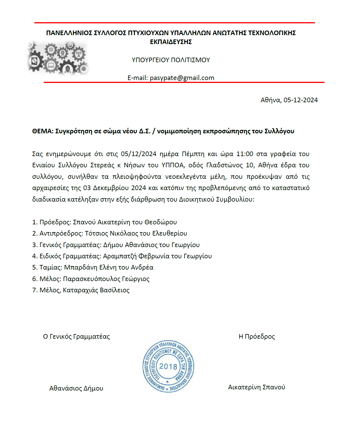 Σας ενημερώνουμε ότι στις 05/12/2024 ημέρα Πέμπτη και ώρα 11:00 στα γραφεία του Ενιαίου Συλλόγου Στερεάς κ Νήσων του ΥΠΠΟΑ, οδός Γλαδστώνος 10, Αθήνα έδρα του συλλόγου, συνήλθαν τα πλειοψηφούντα νεοεκλεγέντα μέλη, που προέκυψαν από τις αρχαιρεσίες της 03 Δεκεμβρίου 2024 και κατόπιν της προβλεπόμενης από το καταστατικό διαδικασία κατέληξαν στην εξής διάρθρωση του Διοικητικού Συμβουλίου: